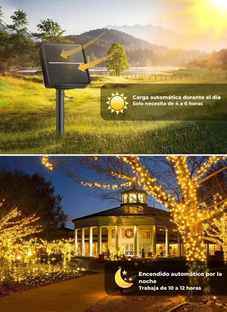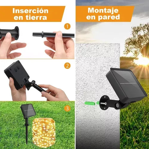 Cada compra viene con un panel solar, una estaca y un cable de 10m con 100 LED.